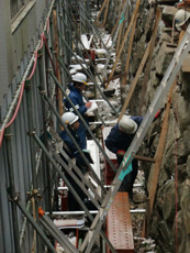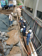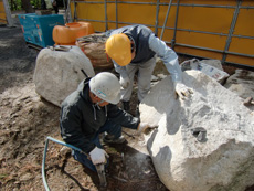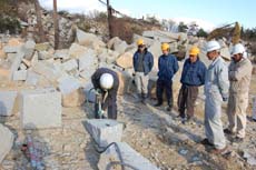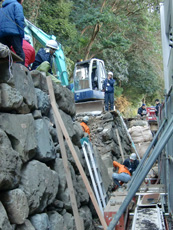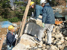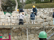 この研修は、熟練技能者が文化財石垣修理工事の現場において、若手の技能者に各種の伝統技能・技術を出ん伝承し、後継者として育成を行うものです。