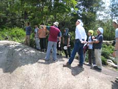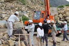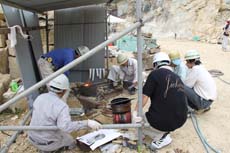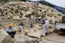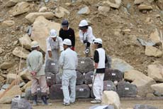 姫路市立城郭研究室で採石場についての講義を受けた後、竜山石採石場で「採石と石積み」の実技実習を行いました。また、岡山県の「前島・犬島」採石現場を見学しました。今回は「瀬戸内の石」について、多くの研修ができました。 |