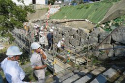 16日には唐津市市民会館(唐津市)において石垣修理の事例や記録作成についての講義を受けました。17日は唐津市高齢者ふれあい会館りふれホールにおいて、唐津城の石垣をテーマに会員以外の方も聴講可能な公開講座を開催しています。最終日は唐津城跡石垣修理現場や谷口石切丁場(唐津市)の見学を実施しました。