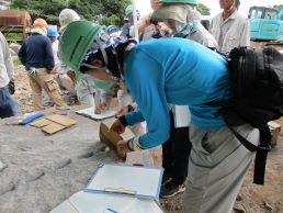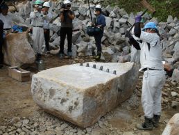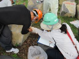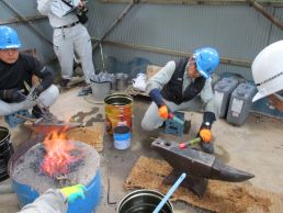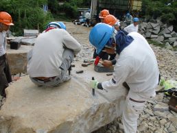 14日には特別史跡熊本城跡(熊本市)において熊本城跡石垣を対象に矢穴調査の実習を行いました。15日からは蟹江石材採石場(熊本市)で技能会員は矢穴による石割とノミや矢などの道具を製作する鍛冶実習、技術・研究会員はそれらの作業の記録作成について実習を行いましました。