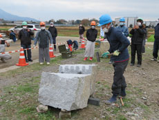 雨引観音大石垣(茨城県桜川市)において、26日に石垣の観察と調査の実習を行いました。27日から茨城県立真壁高等学校稲荷原農場(茨城県桜川市真壁)において、技能会員は2班に分かれて真壁石(花崗岩)の石割、加工、石積とノミ等の道具の鍛冶。技術・研究会員はそれらの作業の記録作成について実習を実施しています。